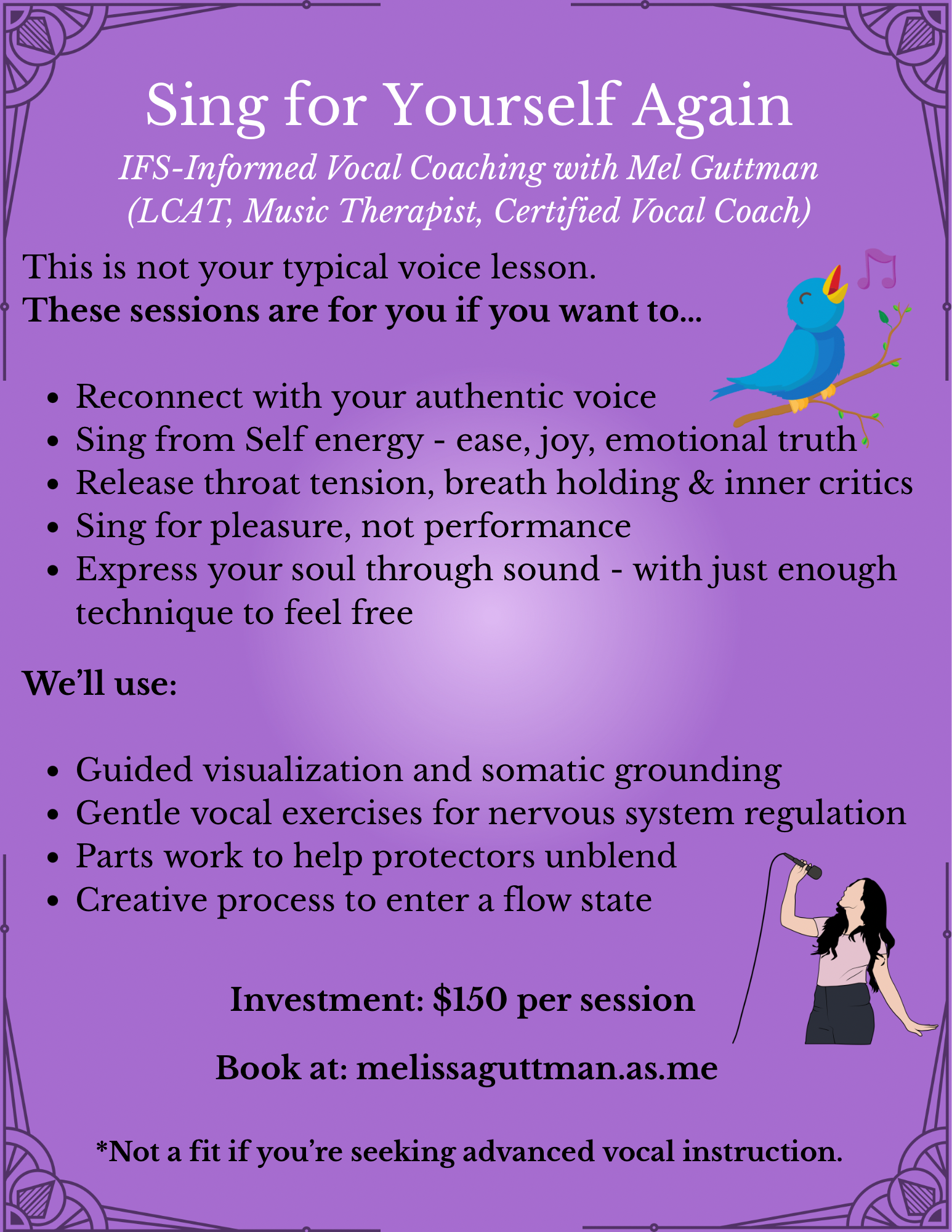 We see these parts as “protectors” because deep down they have good intentions. They often want to protect you from rejection. We hear them out and ask them to “unblend” so that you can sing with less tension. There is nothing wrong with your voice — it’s just hidden behind your fears. I can’t wait to help you uncover it!